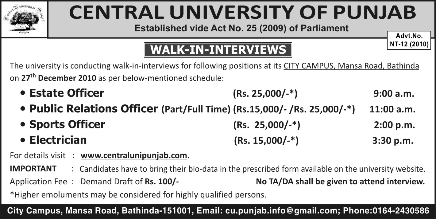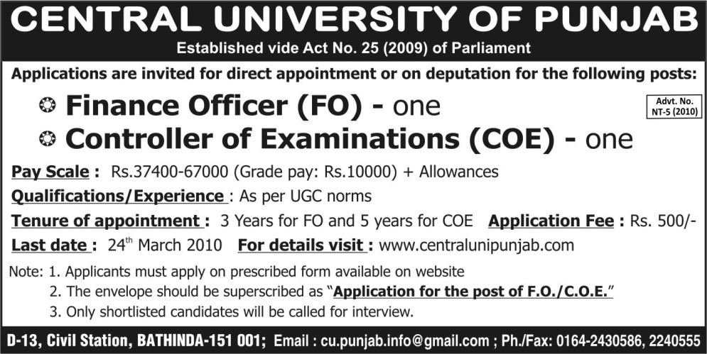 NT-11 (2010) Post of Registrar and Finance Officer: Qualifications & Application Form