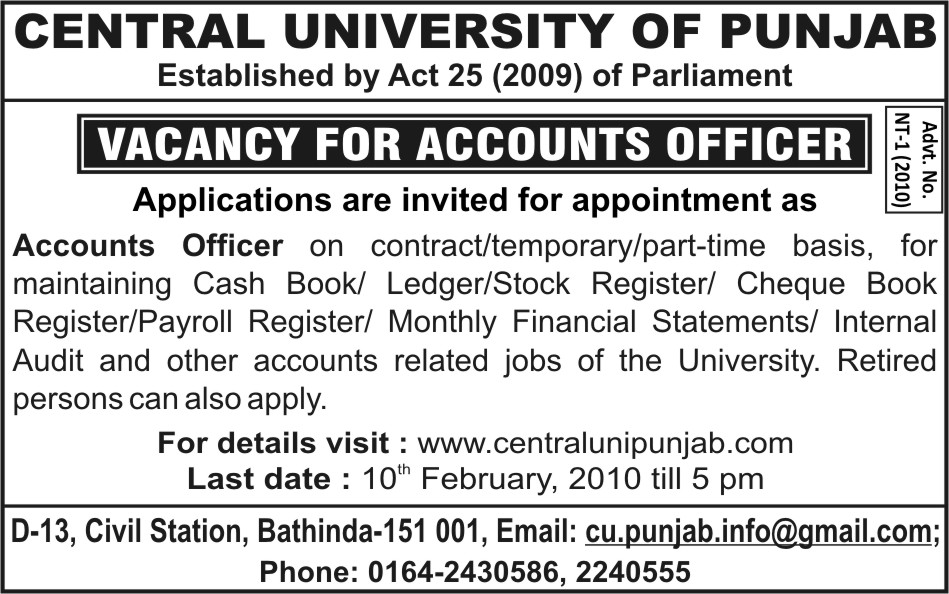 Advertisement for the Post of Accounts Officer NT-01 (2010)
