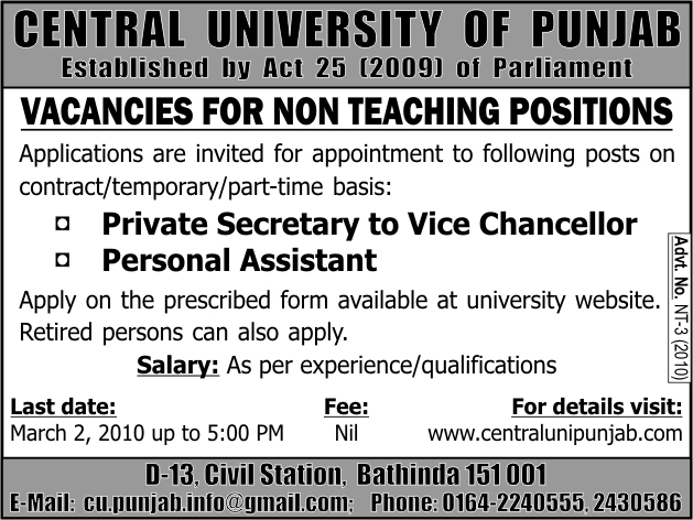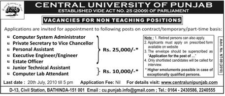 Vacancies for Non Teaching Positions Advt No.NT-02 (2010)