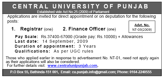 Post of Registrar & Finance Officer - Adv. No. NT-03 (2009)